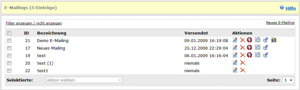 | Auswahlboxen | Sie können mehrere E-Mailings mit Hilfe der Auswahlboxen
