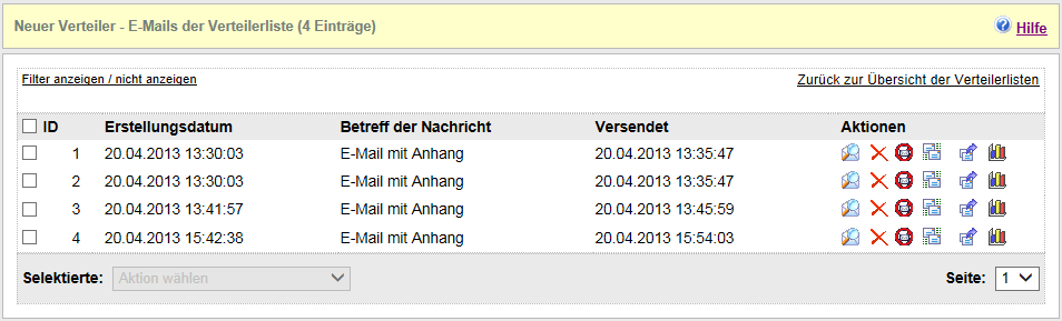 | Auswahlboxen | Sie können mehrere E-Mails der Verteilerliste mit Hilfe der Auswahlboxen