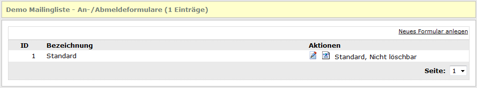 Für jede Empfängerliste können ein oder mehrere An-/Abmeldeformulare erstellt werden. Ein An-/Abmeldeformular enthält dabei alle Eingabefelder, die im Formular angezeigt werden sollen, Verknüpfungen zu definierten Meldungstexten, Verknüpfungen zu definierten HTML-Seiten/Umleitungen und die E-Mail-Texte für die Double-Opt-In/Double-Opt-Out E-Mails sowie die E-Mail-Texte für den Versand der E-Mails nach Anmeldung oder Abmeldung von der Empfängerliste/Newsletter-Verteilers.