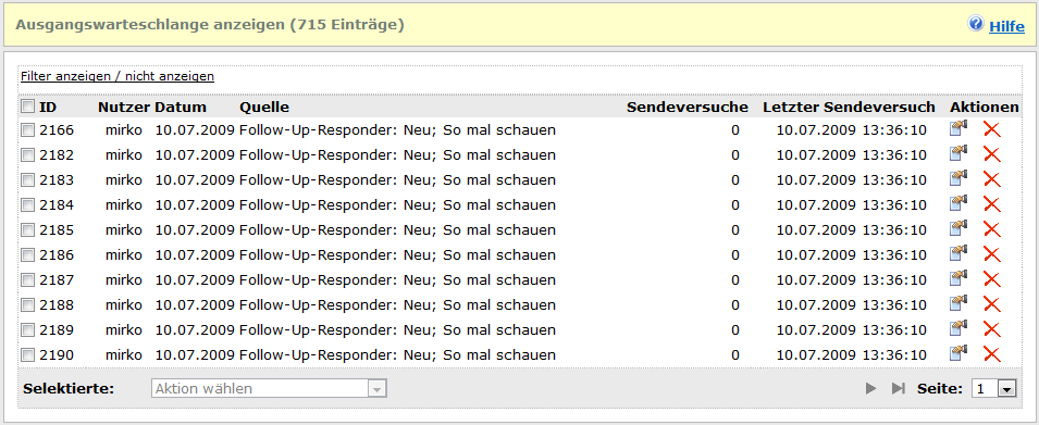 Die Anzeige der Ausgangswarteschlange ist nur als Administrator möglich, wobei ein Administrator nur die eigenen Einträge sehen kann. Als SuperAdmin können die Einträge eines jeden Administrators angezeigt werden.
