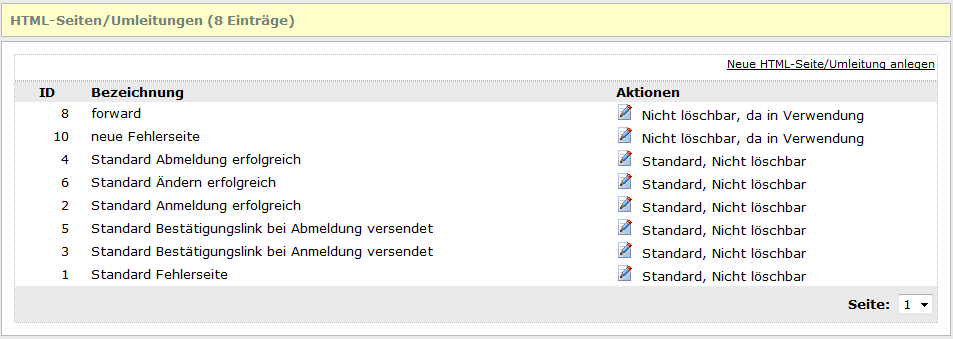 Die HTML-Seiten/Umleitungen werden den An-/Abmeldeformularen zugewiesen. Es können verschiedene HTML-Seiten/Umleitungen definiert werden z.B. um mehrsprachige An-/Abmeldeformulare zu erstellen.