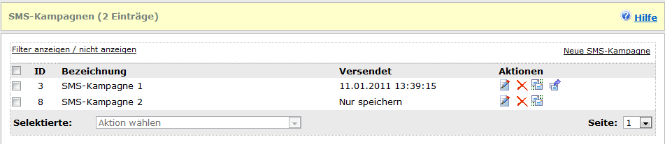 | Auswahlboxen | Sie können mehrere SMS-Kampagnen mit Hilfe der Auswahlboxen