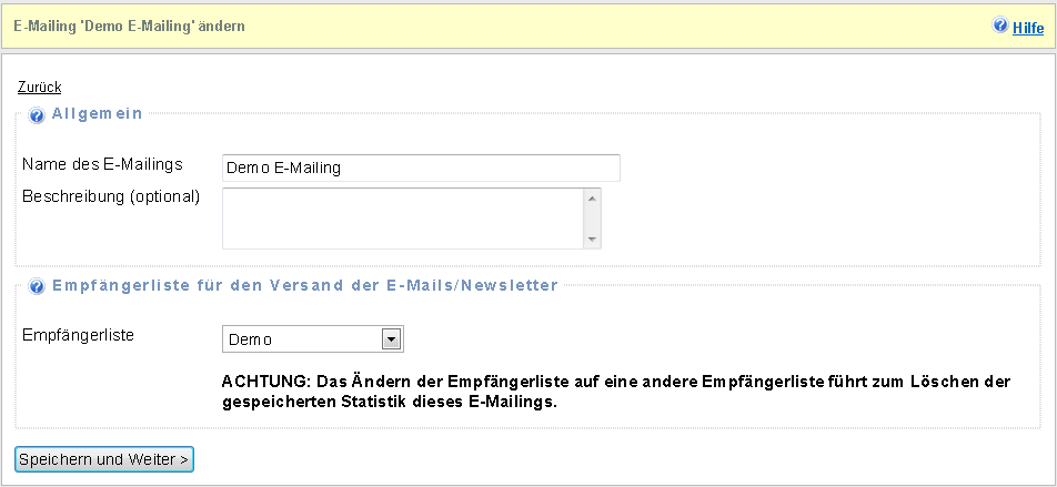 Hinweis: Sollten Sie bei einem bestehenden E-Mailing die Empfängerliste ändern, dann wird die Statistik des E-Mailings komplett und unwiederbringlich gelöscht.