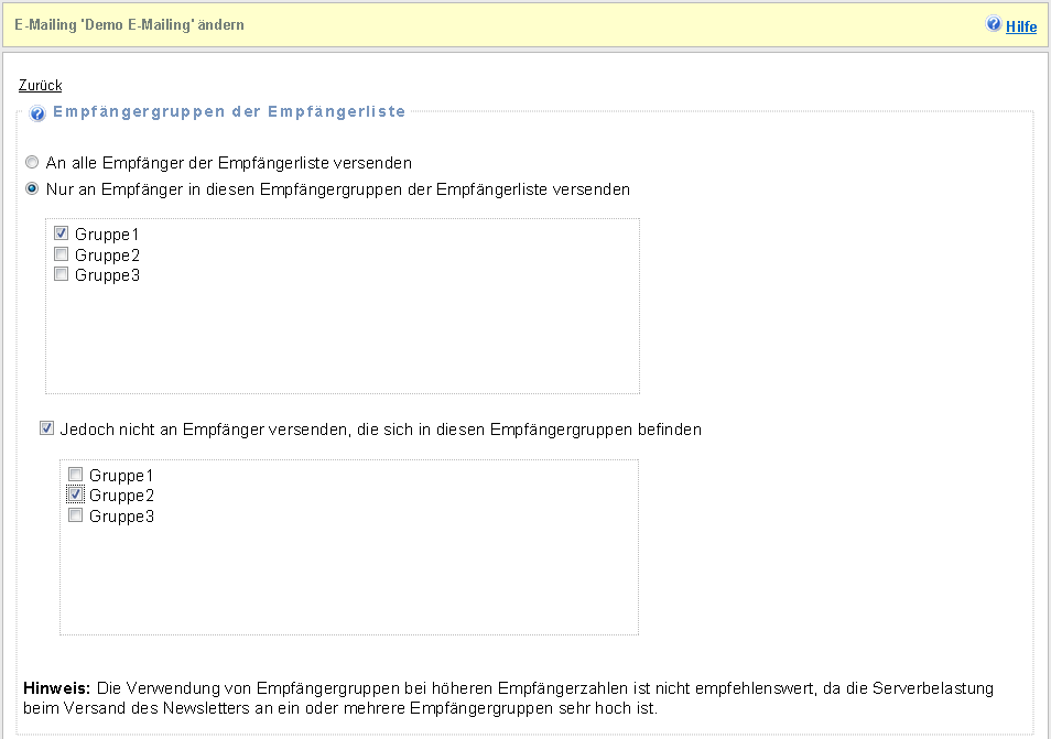 Hinweis: Die Verwendung von Empfängergruppen bei höheren Empfängerzahlen ist nicht empfehlenswert, da die Serverbelastung beim Versand des Newsletters an ein oder mehrere Empfängergruppen sehr hoch ist.