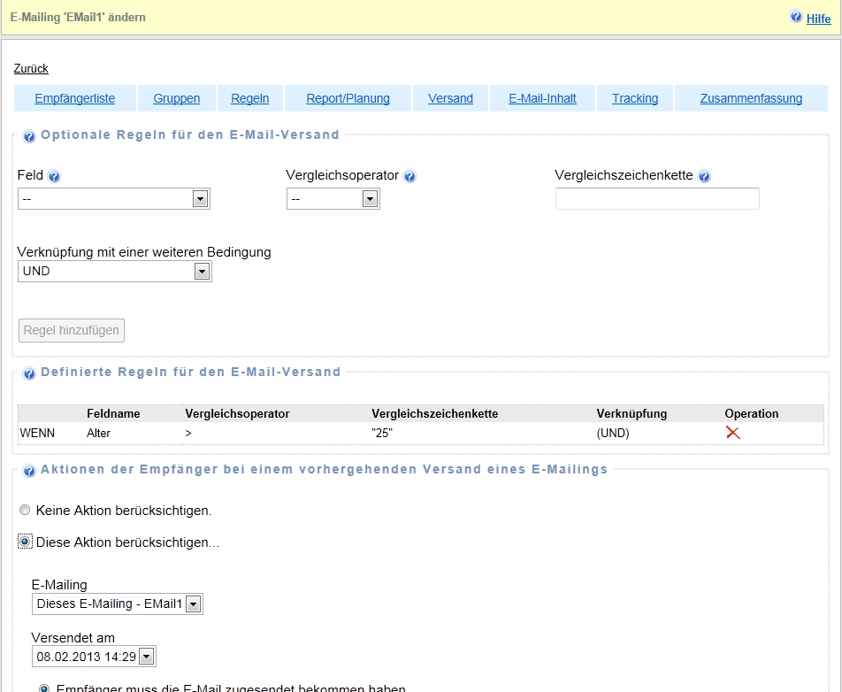 Optional können Regeln für den Versand der E-Mails definiert werden z.B. um nur eine bestimmte Zielgruppe anzusprechen. Möchten Sie keine Regeln definieren, dann klicken Sie einfach auf "Speichern und Weiter >".