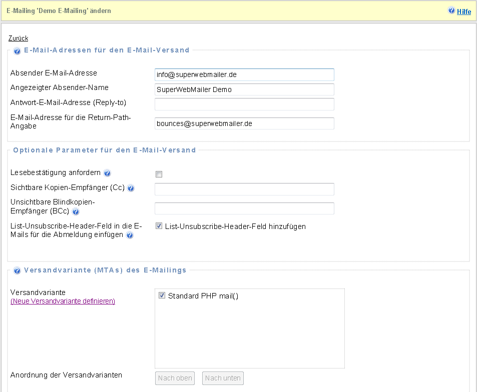 Legen Sie die zu verwendenden Absenderdaten und Versandvarianten fest. Die Absenderdaten können nur verändert werden, wenn für die Empfängerliste die Einstellung "Bei der Erstellung von E-Mails und Formularen dürfen die E-Mail-Adress-Angaben verändert werden" aktiviert ist.