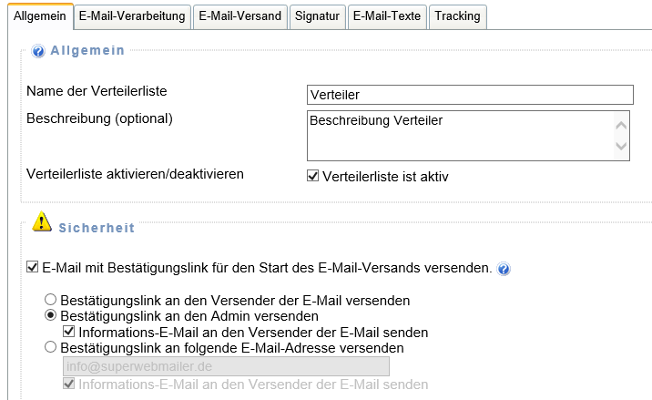 | E-Mail mit Bestätigungslink für den Start des E-Mail-Versands versenden | Die Verwendung dieser Einstellung ist empfohlen.