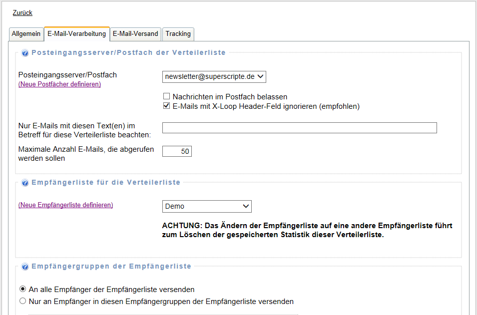 E-Mails versenden soll. Hinweis: Beim Wechsel der Empfängerliste wird die komplette Statistik des Verteilers dauerhaft gelöscht. |