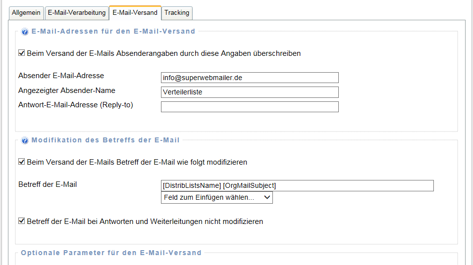 | Beim Versand der E-Mails Absenderangaben durch diese Angaben überschreiben |