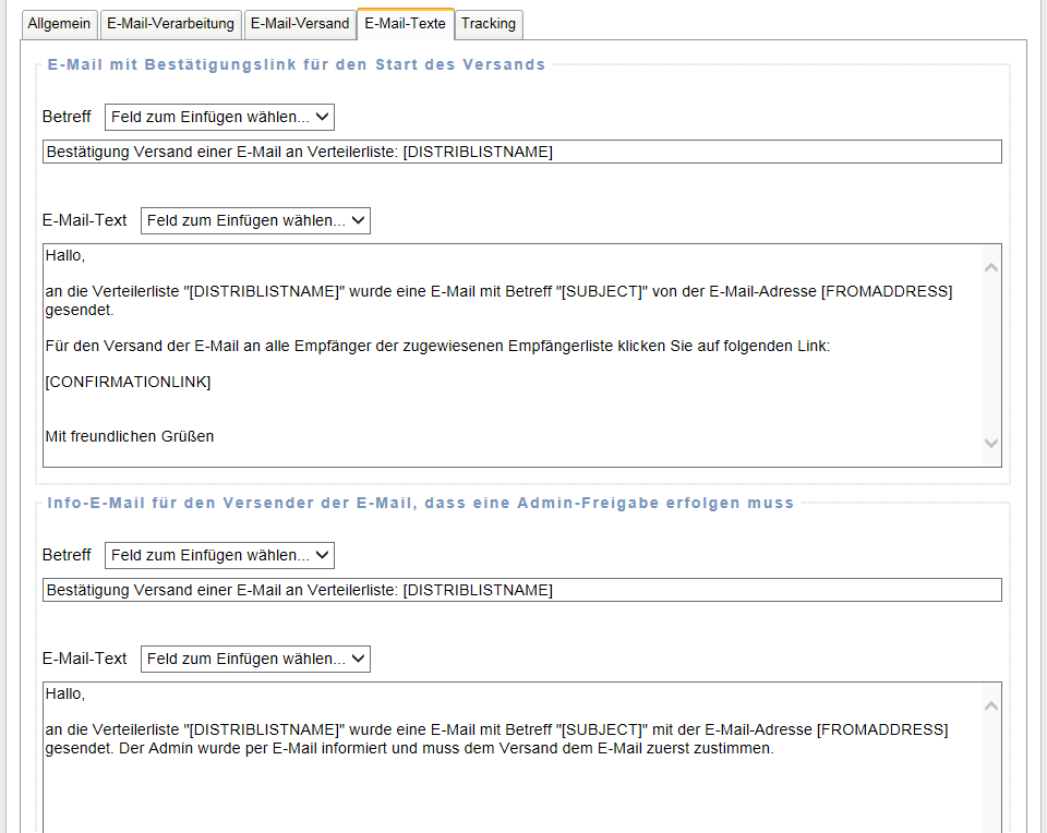 Auf dieser Registerkarte können die E-Mail-Betreffs und E-Mail-Texte für die Freigabe des Versands und die Informations-E-Mails für den Versender definiert werden. Die E-Mail-Texte können nur im reinen Text-Format definiert werden, alle E-Mail-Betreffs und E-Mail-Texte müssen ausgefüllt werden.