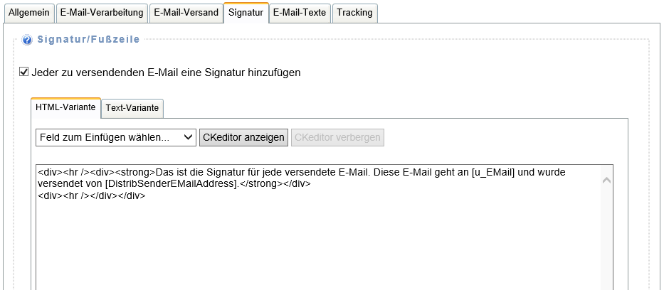 Auf dieser Registerkarte können Sie angeben, dass jeder zu versendenden E-Mail eine Signatur hinzugefügt werden soll.