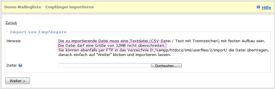 manuell die Datei mit einem FTP-Programm in das userfiles/<user-id>/import-Verzeichnis