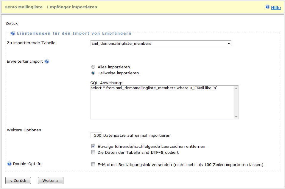 Datensätze aus der gewählten Tabelle importieren zu lassen. Wählen Sie "Teilweise importieren" und geben Sie korrekt eine eigene SQL-Anweisung ein. Hinweise zur eigenen SQL-Anweisung