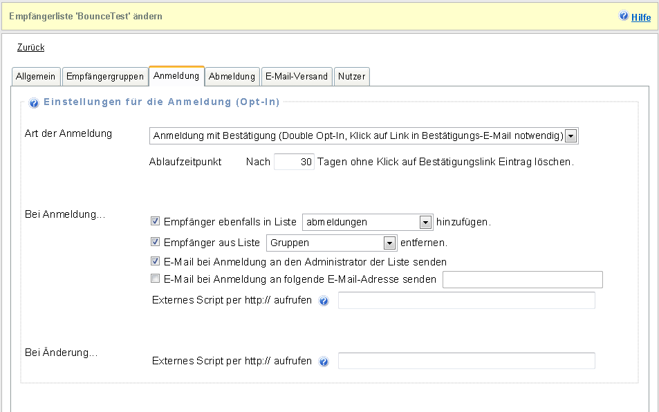 Nur bei Anmeldung mit Double-Option Der Ablaufzeitpunkt bestimmt wann eine nicht bestätigte Anmeldung wieder aus der Empfängerliste gelöscht wird. Klickt der neue Newsletter-Abonnent nach diesem Zeitpunkt auf den Bestätigungslink, dann muss er sich neu anmelden. Das Löschen der nicht bestätigten Anmeldungen wird durch das CronJob-Script ausgeführt.