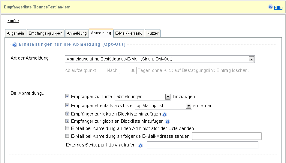 Die Variante "Abmeldung ohne Bestätigungs-E-Mail (Single Opt-Out)" ist zu bevorzugen, d.h. der Empfänger wird nach Abmeldung sofort aus der Empfängerliste entfernt.