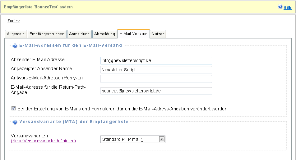 | Versandvarianten (MTA = Mail Transfer Agent) der Empfängerlisten | Wählen Sie die Versandvariante aus, welcher für den