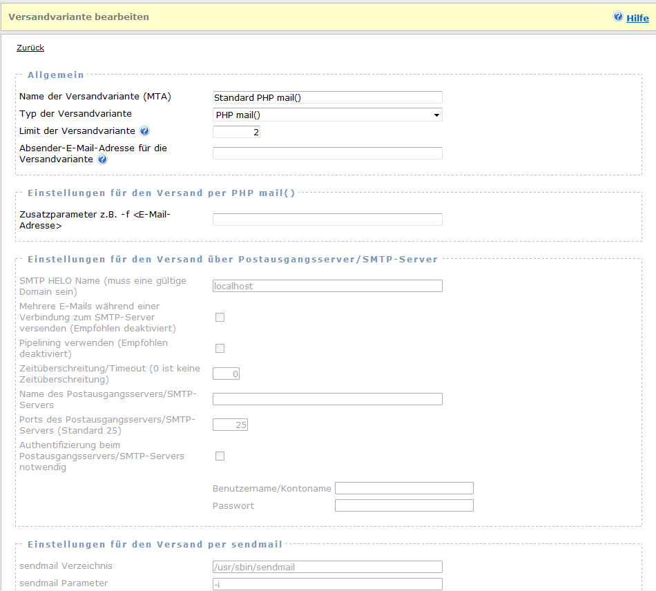 | sendmail Parameter | Geben Sie die notwendigen sendmail-Parameter ein.