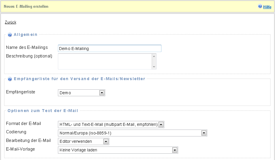 | Name des E-Mailings | Geben Sie Ihrem E-Mailing einen neuen Namen z.B. Newsletter