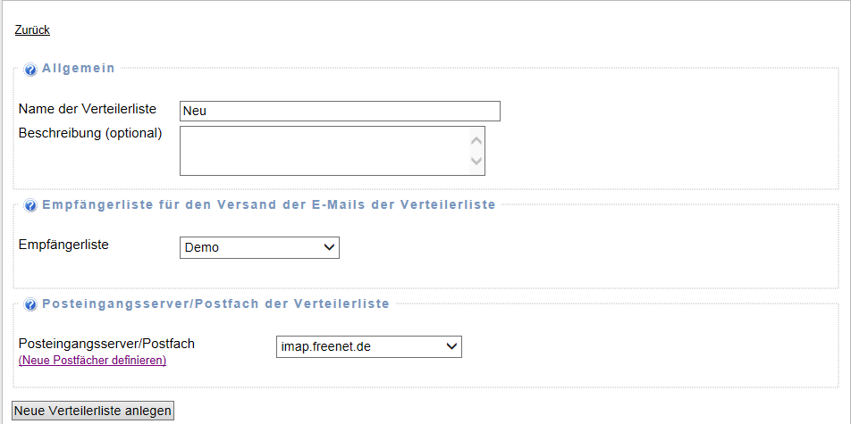 Klicken Sie auf "Neue Verteilerliste anlegen", um die Verteilerliste zu erstellen und weitere Einstellungen festzulegen.