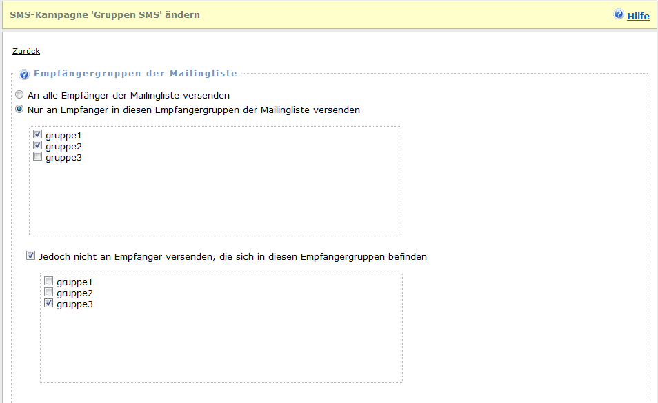 | Nur an Empfänger in diesen Empfängergruppen der Empfängerliste versenden | Wählen Sie die Empfängergruppen aus, an welche die SMS