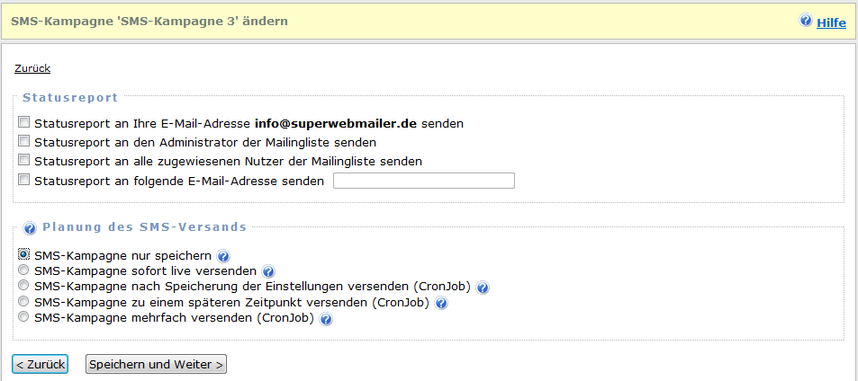 SMS-Kampagne nur speichern Speichert nur die SMS-Kampagne. Sie können später nochmals die Einstellung der SMS-Kampagne ändern und eine andere Option wählen, um den SMS-Versand anzustoßen.