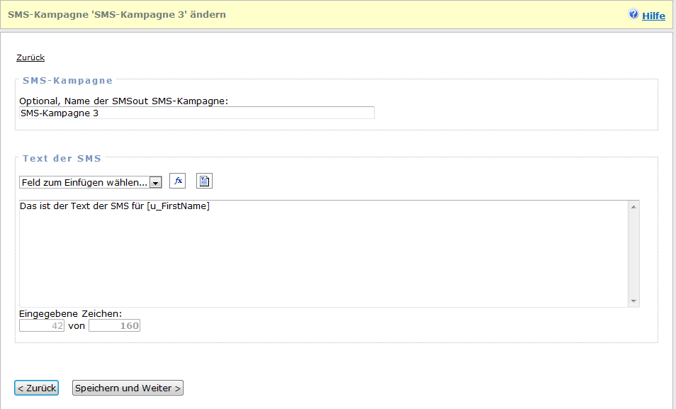 | Optional, Name der SMSout SMS-Kampagne | Es kann der Name einer SMS-Kampagne eingegeben werden. Im SMSout-Kundenbereich