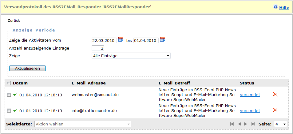 Im Versandprotokoll werden alle versendeten RSS2EMail-E-Mails dargestellt.