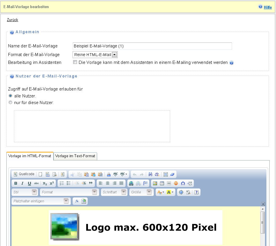 | Nutzer der E-Mail-Vorlage | Wählen Sie "alle Nutzer", um allen